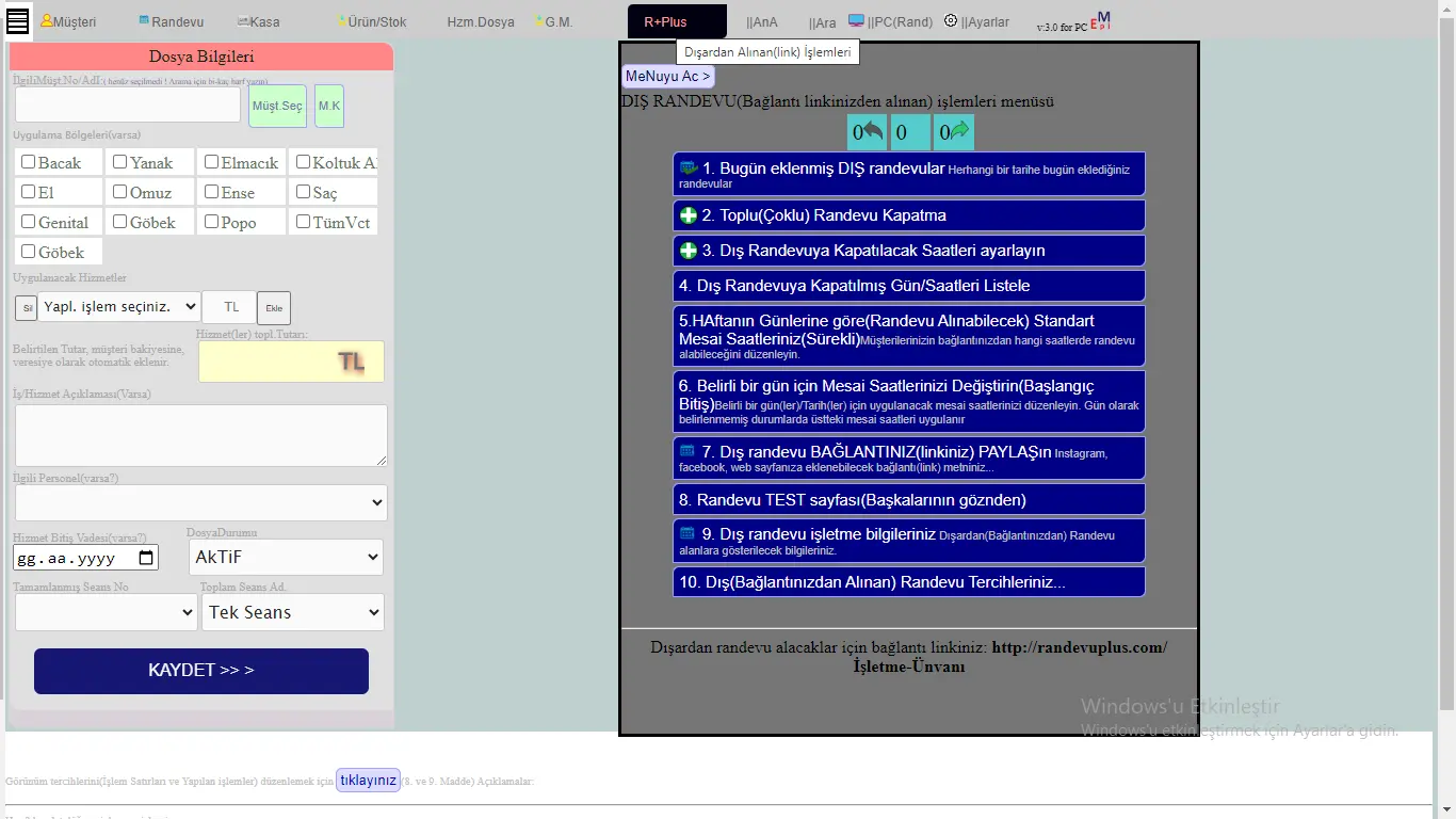 Sağlayacağımız online randevu baglantısı ile müşterilerinizin, gerçek zamanlı, anlık yoğunluğunuzu görerek kendi randevularını almalarını sağlayabilirsiniz. Online randevu baglantınızı facebook, instagram... web sayfanızda paylaşabilirsiniz. Baglantınızdan alınan randevulardan anında haberdar olursunuz.